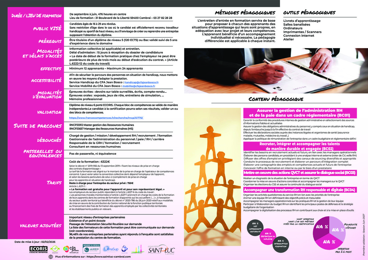 Diplôme de niveau 6 porté ECORIS. Chaque bloc de compétences se valide de manière indépendante.