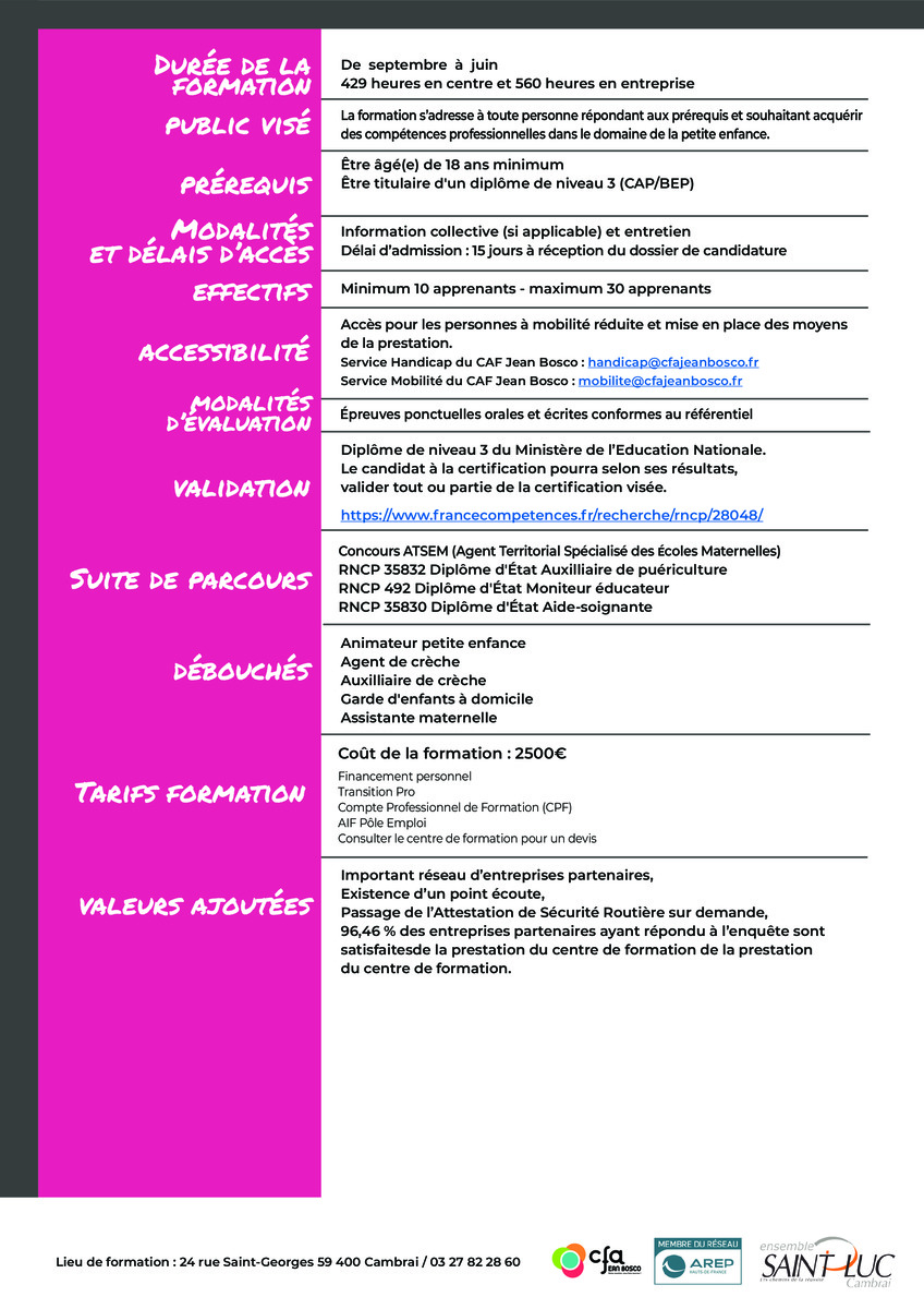Lieu de formation : 24 rue Saint Georges 59400 Cambrai – 03 27 82 28 60