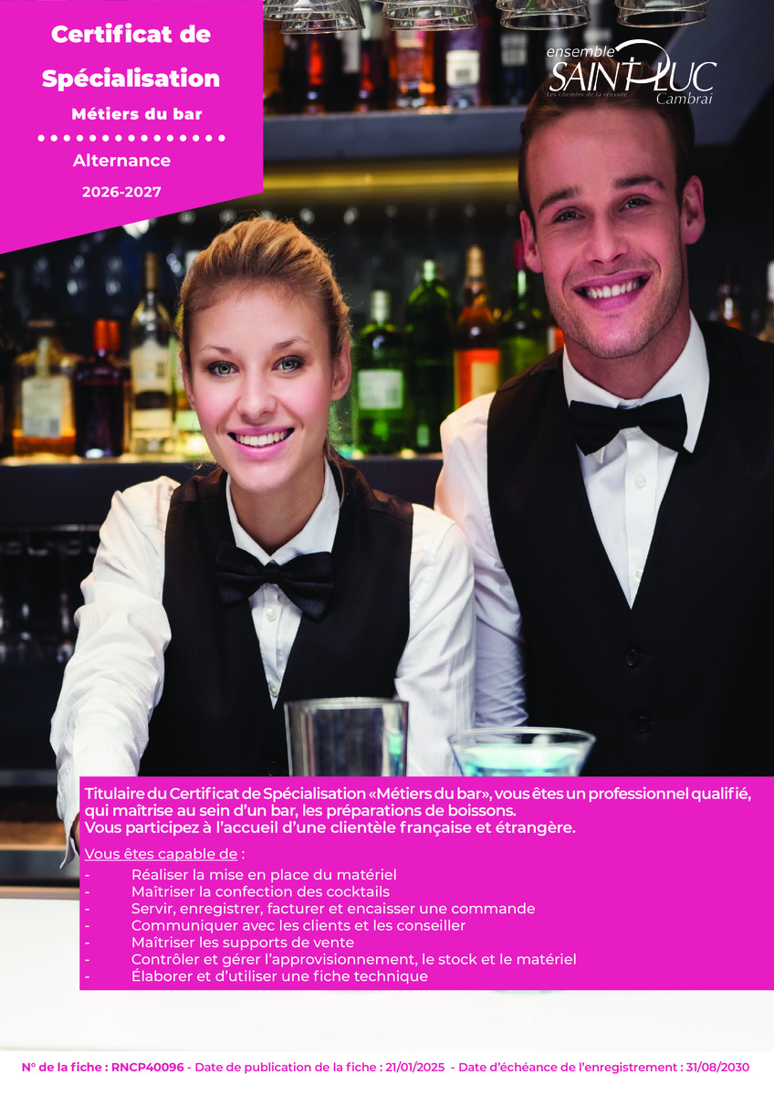 Titulaire du Certificat de Spécialisation «Métiers du bar», vous êtes un professionnel qualifié, qui maîtrise au sein d’un bar, les préparations de boissons. Vous participez à l’accueil d’une clientèle française et étrangère.