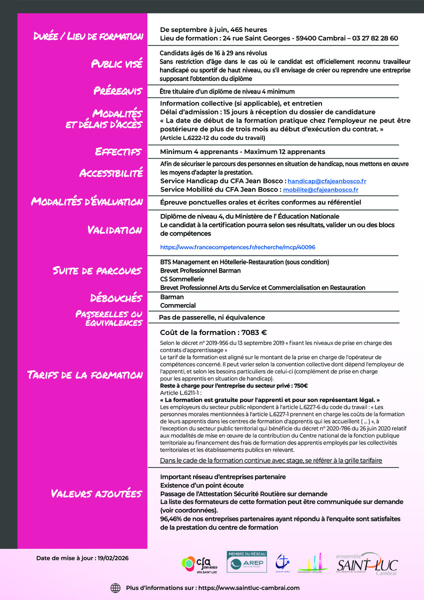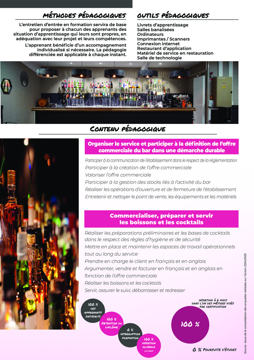 La formation s’adresse à toute personne répondant aux prérequis et souhaitant acquérir des compétences professionnelles dans le domaine du service de bar